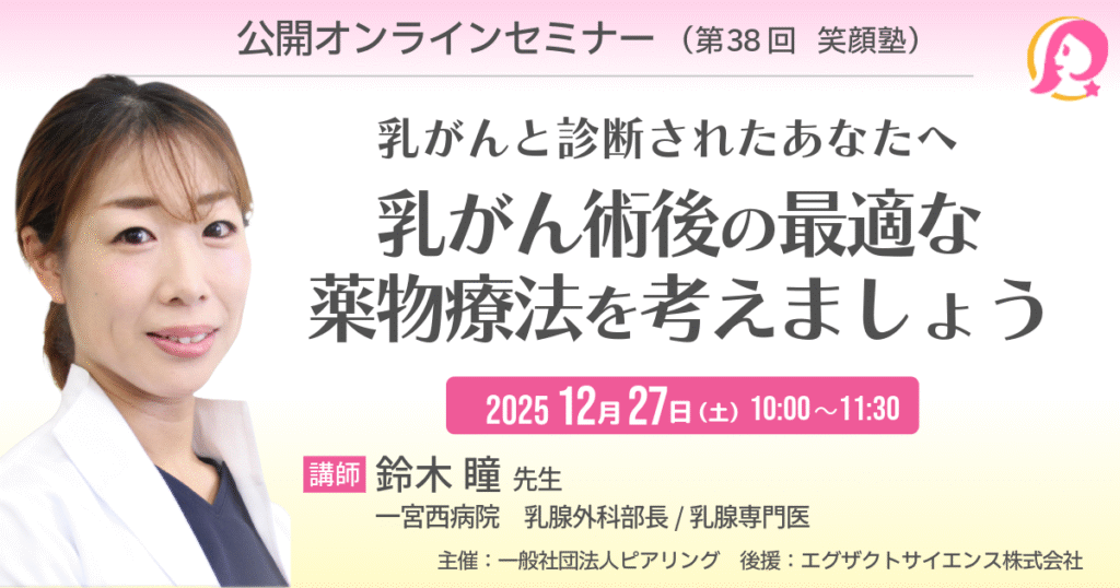 12月27日(土)10時~!乳がん治療の選択についてのオンラインセミナー(ピアリング笑顔塾、参加無料)を開催します。